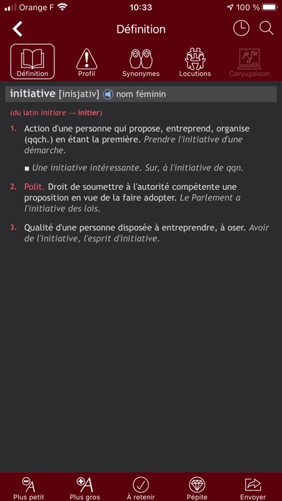 Outre les définitions (normal pour un dictionnaire 🙂 ), Le Robert Mobile présente des précisions sur les mots (appelées ici Profil), les synonymes et des locutions et expressions.