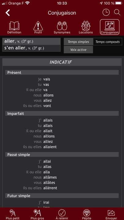 Concernant les verbes, on accède à tous les temps de conjugaison, à la forme active, et passive lorsqu’elle existe.