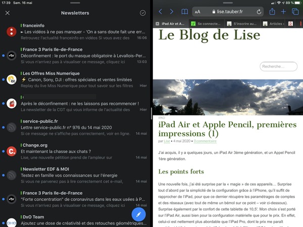 Pour les apps compatibles, comme des celles d’Apple (Safari, Messages) ou d’autres, comme PDF Expert (sur laquelle je reviendrai) ou le client mail Spark, cela permet de consulter une liste pendant qu’on répond à un message par exemple.