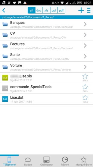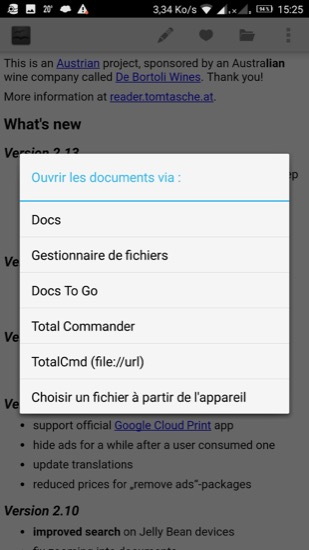 J’ai décrit plus précisément cette suite dans l’article DocsToGo pour Android. C’est le logiciel que j’utilise, car c’est un bon gestionnaire de fichiers, qui permet d’ouvrir les fichiers dans l’application appropriée, par exemple un fichier .txt avec l’application qui « sait le lire ».