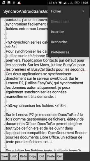 Depuis que j’ai acquis le Lenovo P2 qui tourne sous Android, j’ai testé plusieurs applications de traitement de texte afin de disposer d’un environnement me permettant de rédiger ou travailler sur différents types de fichiers.