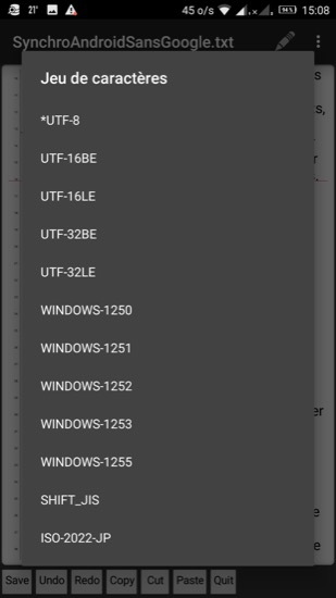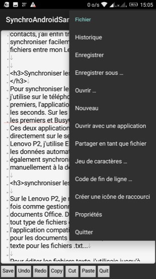 J’utilisais jusqu’à présent Writer, qui est un très bon éditeur de texte. Mais cette app enregistre dans un format propriétaire, que je dois convertir en .txt si je veux ouvrir le fichier avec d’autres applications.