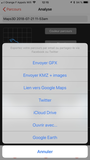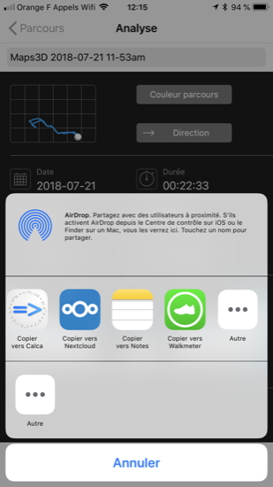 On peut facilement exporter ses parcours dans différents formats et les partager selon plusieurs moyens : mail, iCloud… ou les ouvrir avec d’autres applications. Je pourrais par exemple les mettre en ligne directement sur notre serveur privé NextCloud.