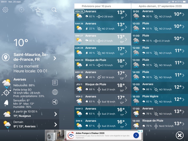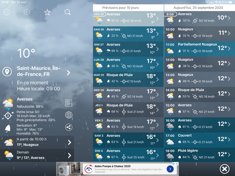 L’application elle-même montre classiquement les prévisions horaires et quotidiennes. Il est évidemment possible de choisir plusieurs localités