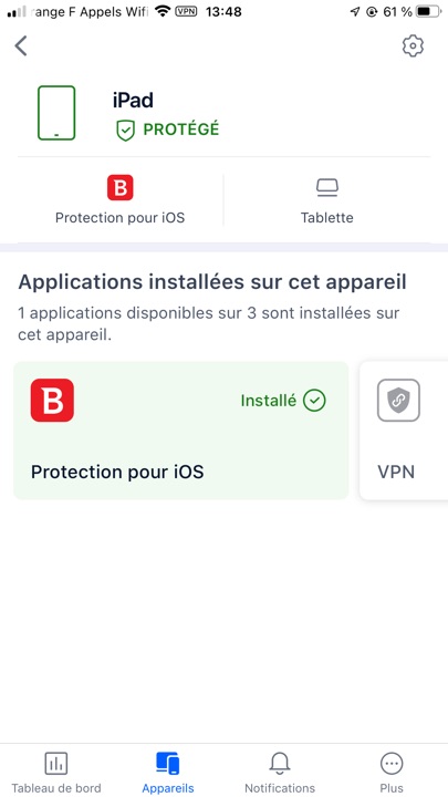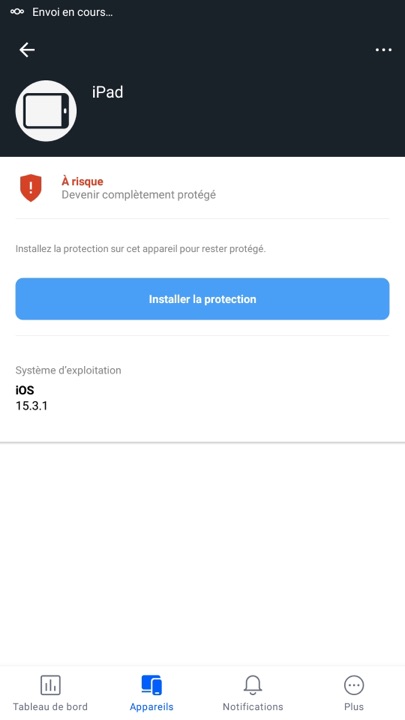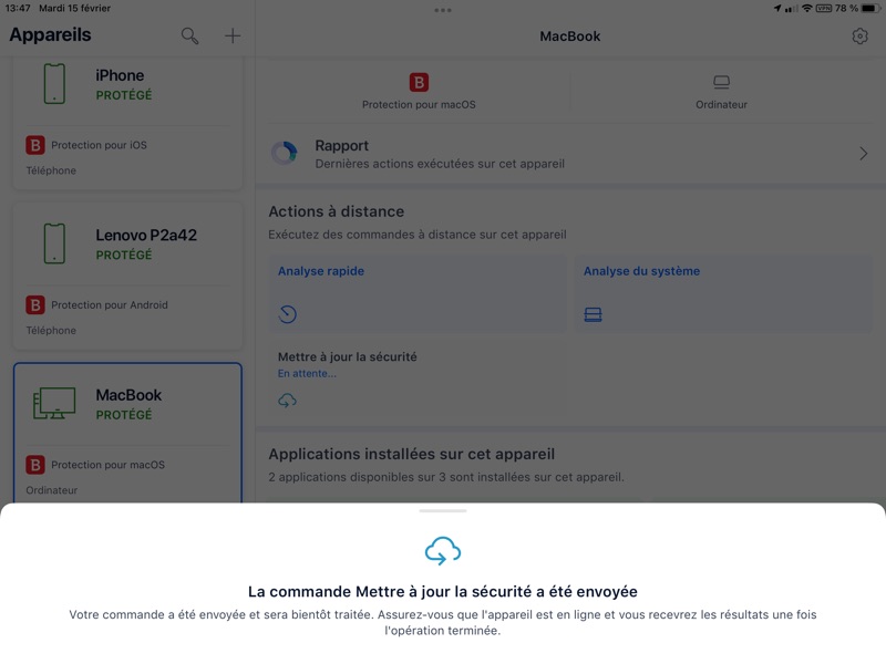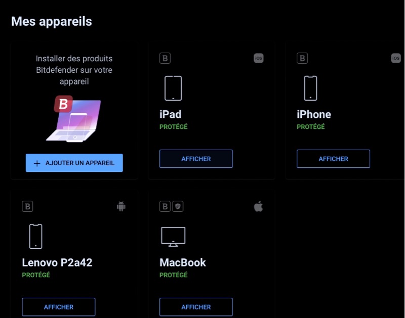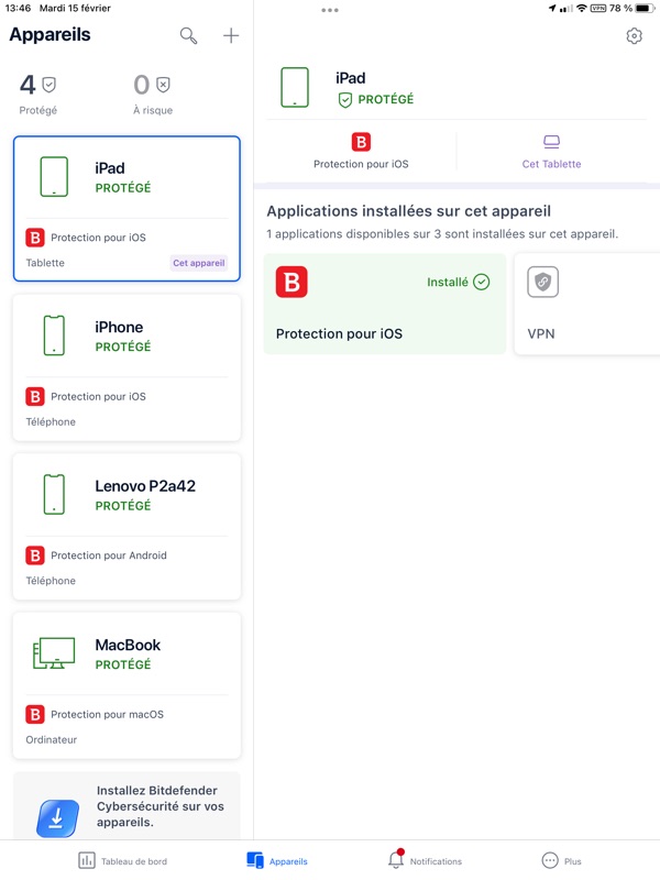 Depuis Bitdefender Central sur iPad, on exécute les mêmes actions.