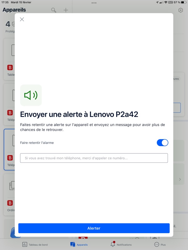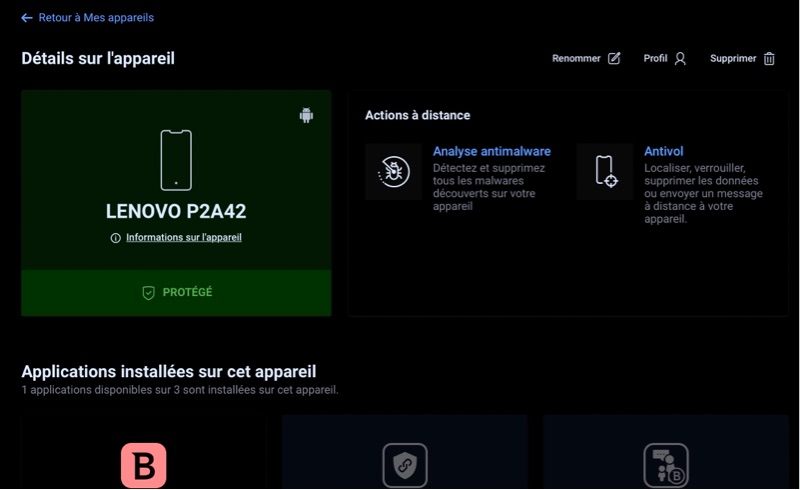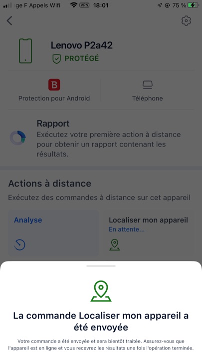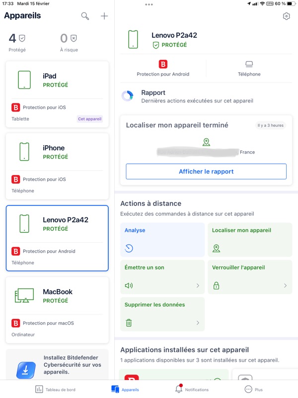 Depuis l’application Bitdefender Central sur l’iPhone, on accède aux mêmes éléments, et aux mêmes actions à effectuer sur un téléphone Android. La localisation du téléphone Android en revanche n’aboutit pas…
