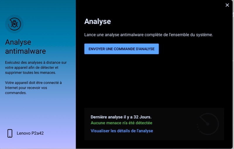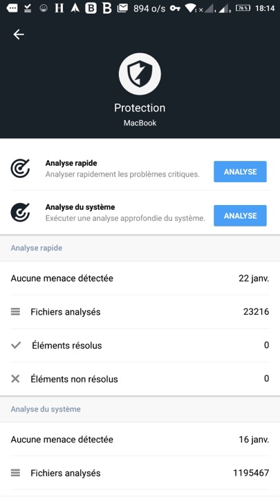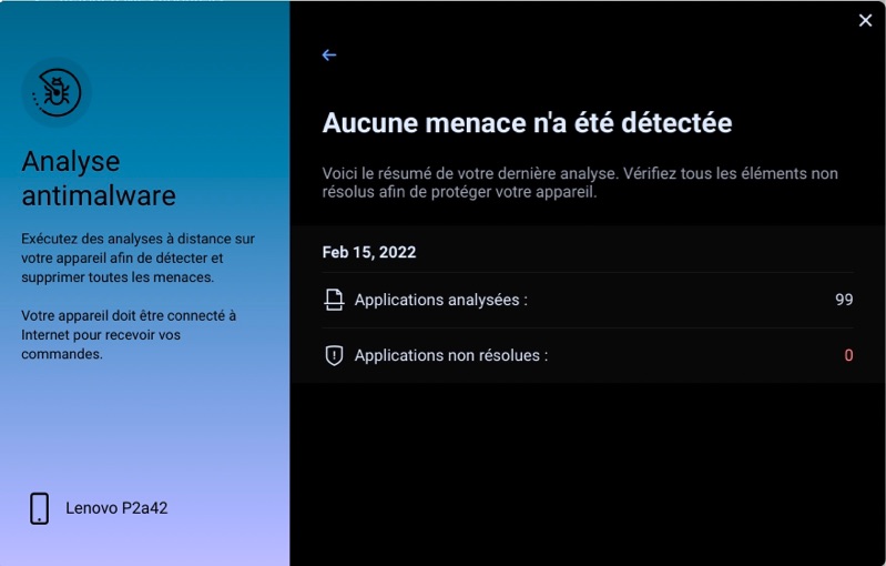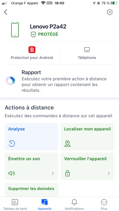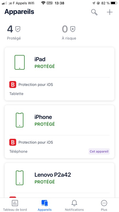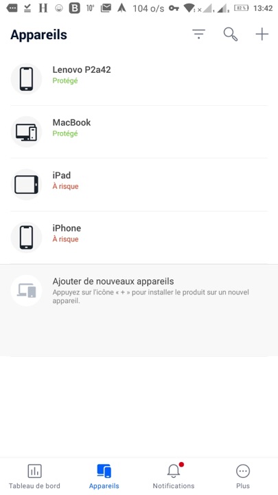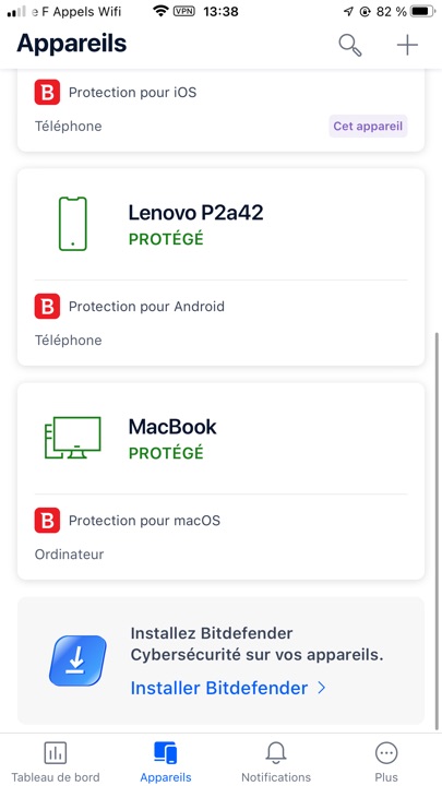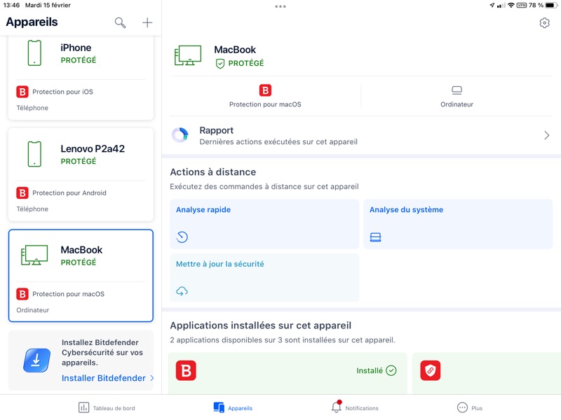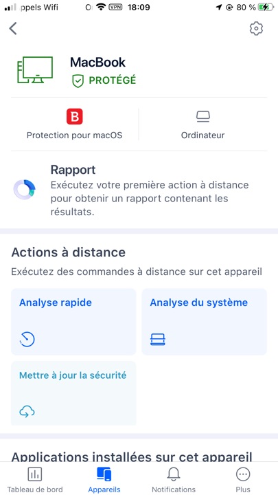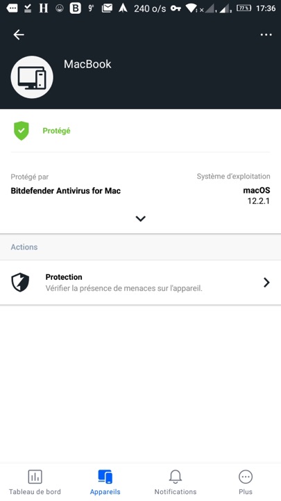 Sur mon téléphone Android, l’iPad et l’iPhone n’apparaissent pas protégés. Mais je peux lancer une analyse de mon Mac depuis cet appareil.