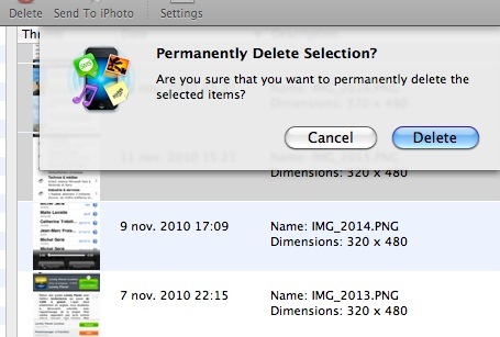 Depuis la sortie de iOS4, certaines opérations n’étaient plus possible : la suppression des photos depuis le Mac, la suppression des appels sélectionnés ou celle des SMS. Avec la mise à jour de PhoneView est revenue la possibilité de supprimer des photos depuis le Mac. Il est effet plus facile, une fois que l’on a transféré ses photos de les supprimer immédiatement depuis son ordinateur. En revanche, les limitations imposées par Apple de suppression des appels ou des SMS sont maintenues (2).