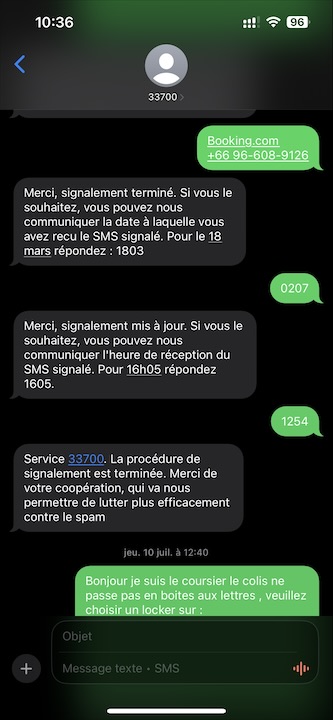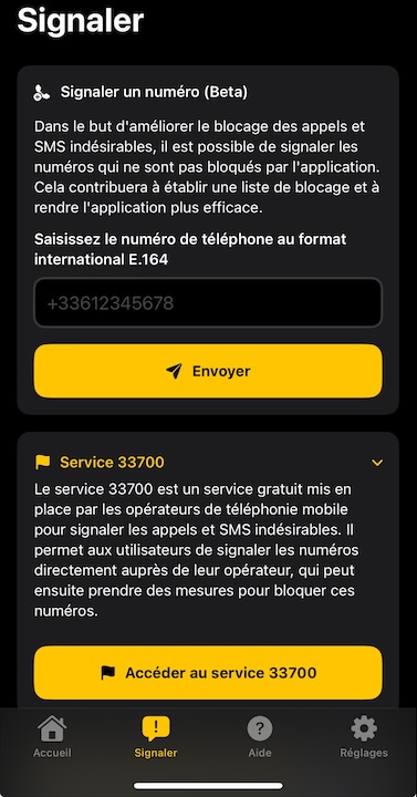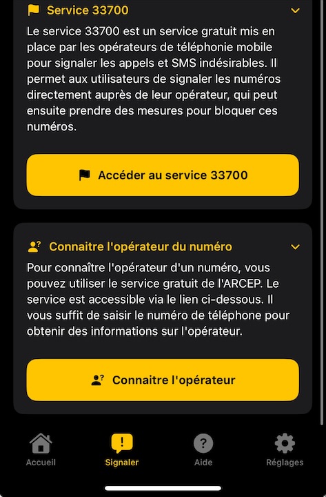 La page de signalement comprend plusieurs options : signaler un numéro directement au développeur afin de compléter la liste des appels bloqués (image 1), signaler des messages au 33700 (image 2) – service de signalement mis en place par les opérateurs de téléphonie mobile, auquel on peut transférer directement un message indésirable depuis l’application Messages – image 3) – , connaître l’opérateur d’un numéro.