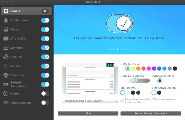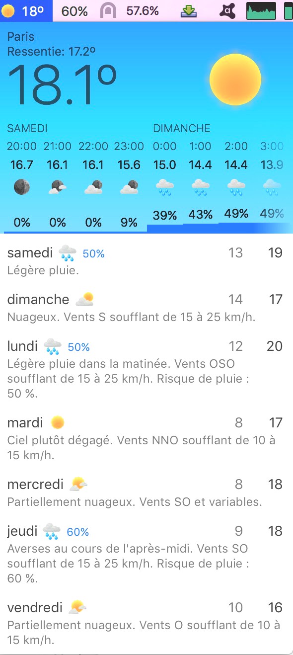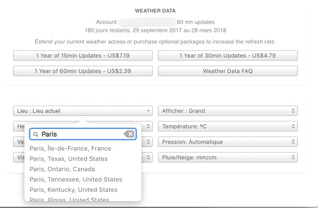 Lors de la mise à jour d’iStat Menus, payante, on a droit à six mois de météo. Ensuite, il faudra s’acquitter de 2 € par an pour une mise à jour heure par heure, de 4 € pour une mise à jour toutes les trente minutes ou de 6 € pour une mise à jour toutes les 15 minutes. On peut bien sûr ne pas afficher la météo…