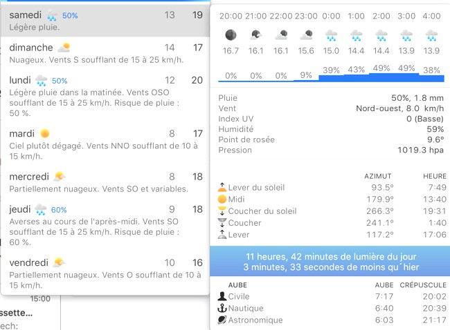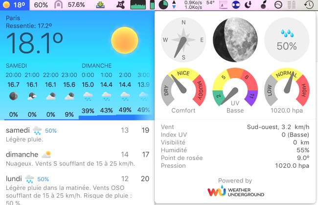 Grosse nouveauté de cette version, un menu dédié à la météo. Sont présentes dans la barre de menu la température et le temps qu’il fait. On peut afficher des informations complémentaires, soit au survol de la souris, soit en configurant un raccourci clavier. On peut en effet attribuer un raccourci à chaque menu. Le survol de la souris sur un des éléments affiche des informations plus détaillées.