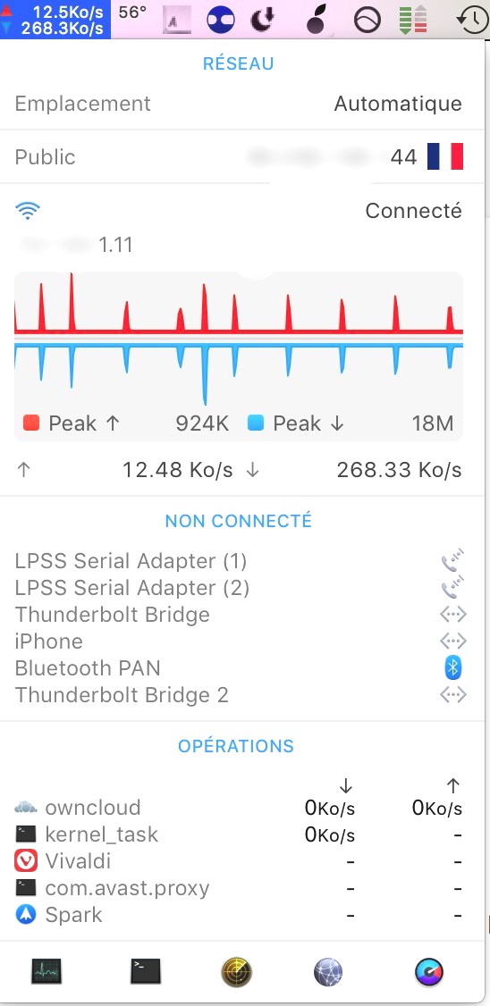 iStat Menus affiche dans la barre de menus les informations relatives au système, et comme pour la météo, de façon détaillée au survol de la souris. On accède rapidement à ses paramètres réseau (image 4).