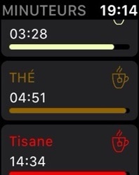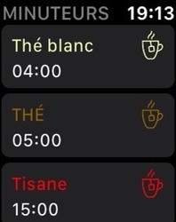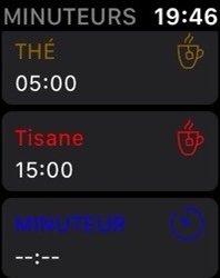 Je me suis servie, pendant un moment, de l’application Minuteur d’Apple sur la montre. Mais d’une part, on ne peut lancer plusieurs minuteurs simultanément, d’autre part, les minuteurs pré-réglés ne correspondent pas à mes besoins. Et le réglage de minuteurs personnalisés me paraît fastidieux !