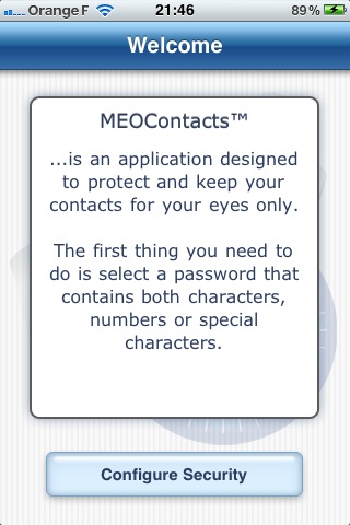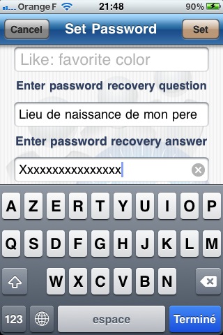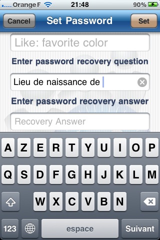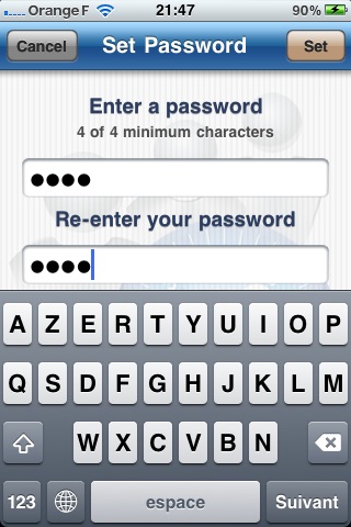 A l’ouverture de l’application, il faut effectuer un tap sur le bouton « Configure Security » et saisir un mot de passe d’au moins 4 caractères puis indiquer une question permettant de retrouver son mot de passe en cas d’oubli.