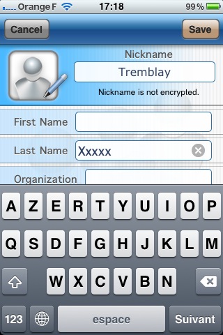 My Eyes Only Contacts précise le niveau de chiffrement utilisé (AES 512 bits pour les coordonnées des contacts, AES 256 bits pour les notes). Une fois les contacts importés dans My Eyes Only Contacts, seuls apparaissent les pseudos attribués au contact. Il est possible de retrouver les coordonnées du contact par le moteur de recherche.