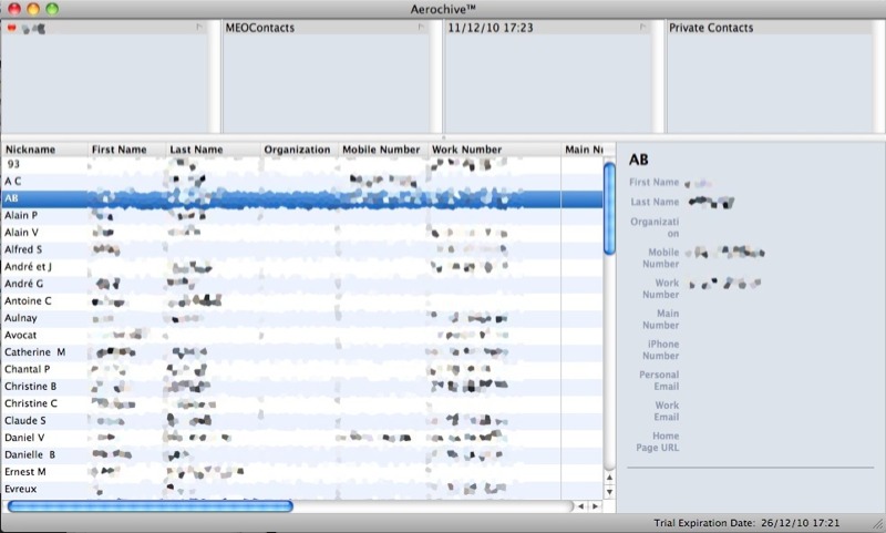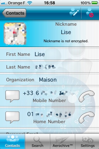 L’importation se fait contact par contact avec chacune de ces applications ; même si My Eyes Only Contacts permet la visualisation des contacts du carnet d’origine par groupes, il n’est pas possible de les importer de façon groupée. Les deux applications permettent d’effectuer des appels, d’envoyer mails et SMS directement. Elles permettent toutes les deux de sauvegarder les contacts sur l’ordinateur. My Eyes Only nécessite l’application Aeroarchive, qui peut être essayée pendant 15 jours.