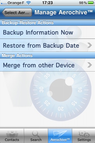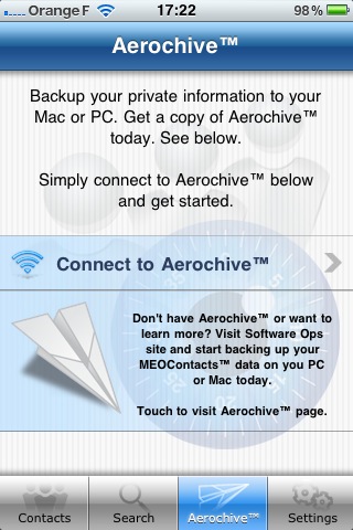 La sauvegarde des contacts s’effectue via l’application Aeroarchive disponible pour Mac OS X et Windows. Cette application permet également la restauration des contacts depuis le iPhone vers l’ordinateur.