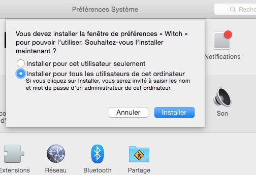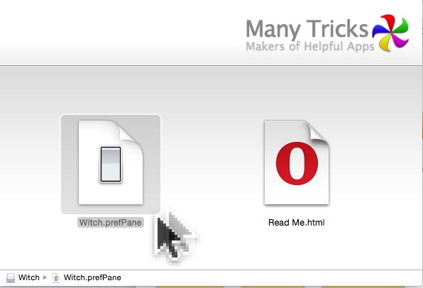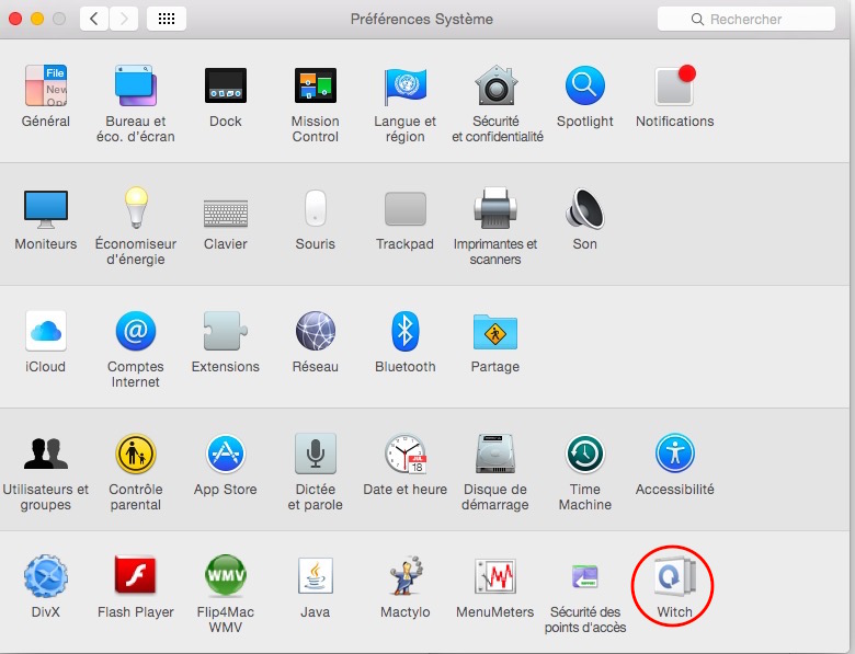 Après avoir téléchargé le fichier .dmg, double-cliquer sur celui-ci pour l’ouvrir, puis double-cliquer sur le fichier Witch.Prefpane.