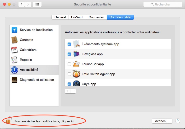 - Depuis les Préférences Système, cliquer sur l’icône Sécurité et confidentialité puis sur l’onglet Confidentialité ;