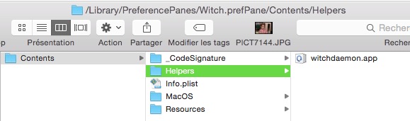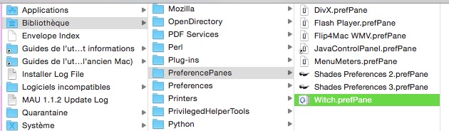 - cliquer sur PreferencePanes, effectuer un clic droit sur Witch.prefPane puis cliquer sur Afficher le contenu du paquet ;