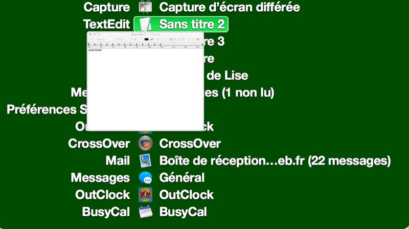 Lorsqu’on configure l’application s’affiche le résultat (image 6). La dernière image montre la personnalisation que j’ai choisie. On voit les trois fenêtres ouvertes du Finder, les deux de TextEdit et les deux de Mail.