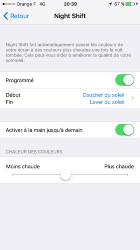 Une des fonctionnalités attendues d’iOS 9.3 était Night Shift, qui permet de disposer d’une lumière orangée en soirée jusqu’au lendemain matin.