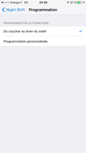 Sous iOS donc, on peut configurer Night Shift soit du coucher au lever de soleil, basé sur le fuseau horaire, soit définir ses propres horaires.