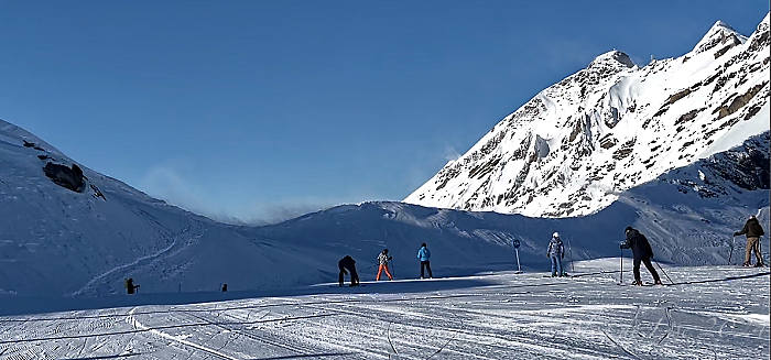 Nous bénéficions toujours d’un grand beau temps, qui devrait durer jusqu’à la fin du séjour (!) ; avec la neige tombée en abondance lors de mon arrivée, les pistes sont partout praticables !