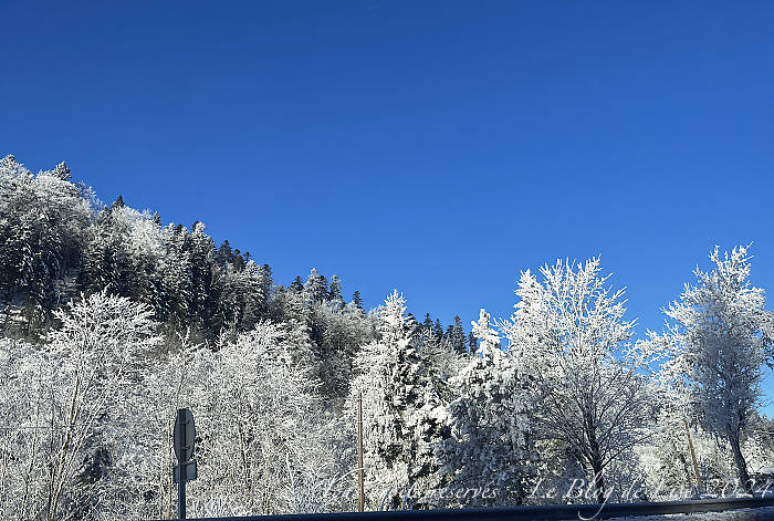 Sur la route du retour, entre soleil et brouillard, les arbres étaient tout givrés… En arrivant à Pontarlier, dans les embouteillages, j’ai pris quelques photos ! et quelques autres lors d’un arrêt…