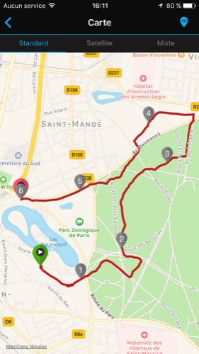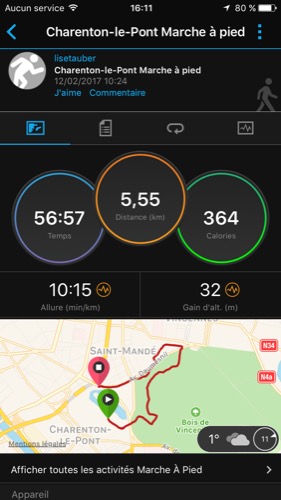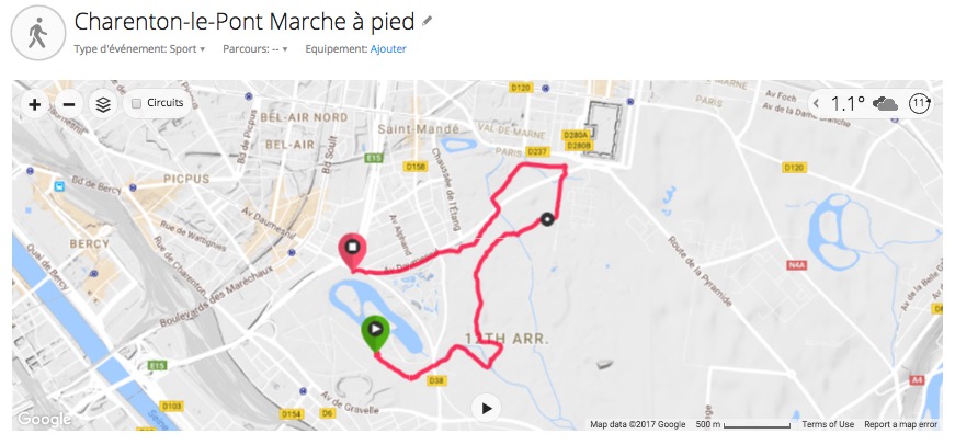 J’ai effectué une nouvelle séance de marche nordique ce matin au bois de Vincennes, après avoir configuré la montre afin que l’enregistrement soit interrompu lors des arrêts (1).