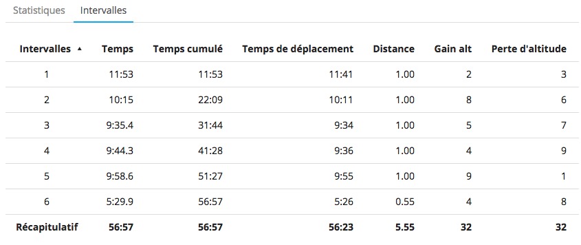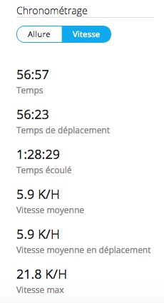 - les intervalles (affichés en allure – temps au km – et non en vitesse – km par heure -, bien que j’aie configuré sur la montre et Garmin Connect ma préférence pour l’affichage de la vitesse,