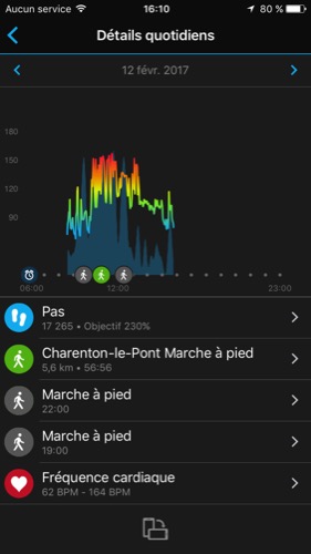 Cette fois-ci, au retour, j’ai commencé par une synchronisation via le Mac vers l’interface web Garmin Connect ; les données se sont synchronisées sur l’iPhone à l’ouverture de l’application. C’est beaucoup plus rapide que la synchronisation entre la montre et l’iPhone en Bluetooth.