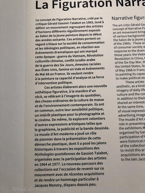 Le Musée d’Art moderne de la ville de Paris, dans l’attente du retour de ses collections, propose un nouvel accrochage d’oeuvres contemporaines : Rumeurs & Légendes avec les oeuvres des artistes de la Figuration Narrative autour de Gilles Aillaud, Antonio Recalcati et Edouardo Arroyo. J’ai bien aimé les tableaux de « Une passion dans le désert » et ceux de Jacques Monory.