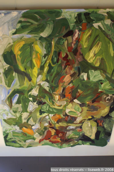 J’ai bien aimé ses toiles, dont beaucoup sont peintes sur des plaques de fibrociment. Cette matière leur donne un caractère mat et lumineux.