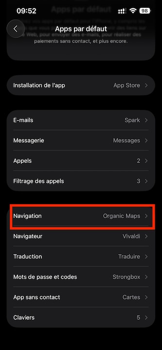 Certaines applications, comme BusyCal ou Walkmeter, listent des apps pouvant être utilisées par défaut, mais pas Organic Maps.