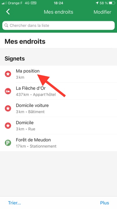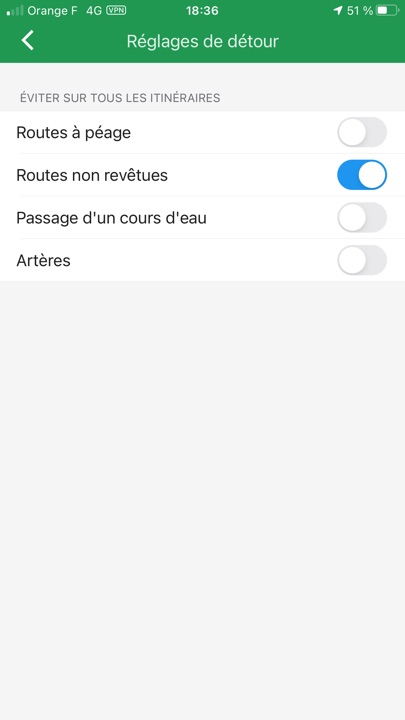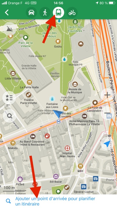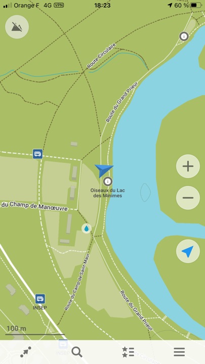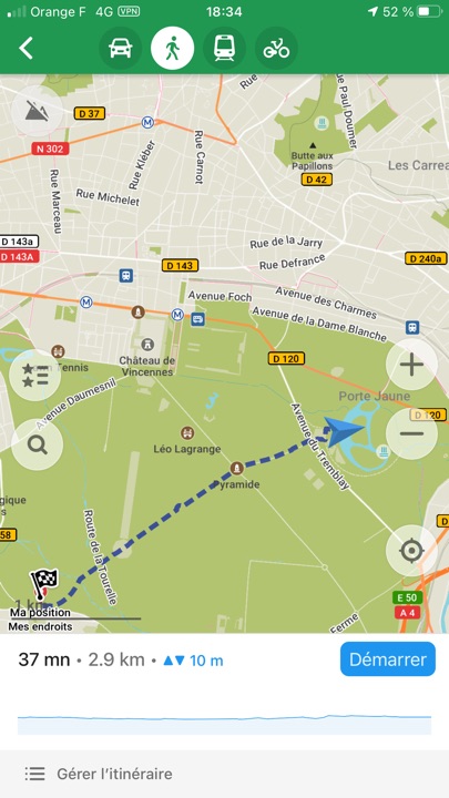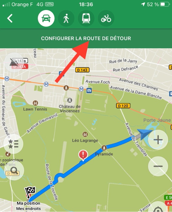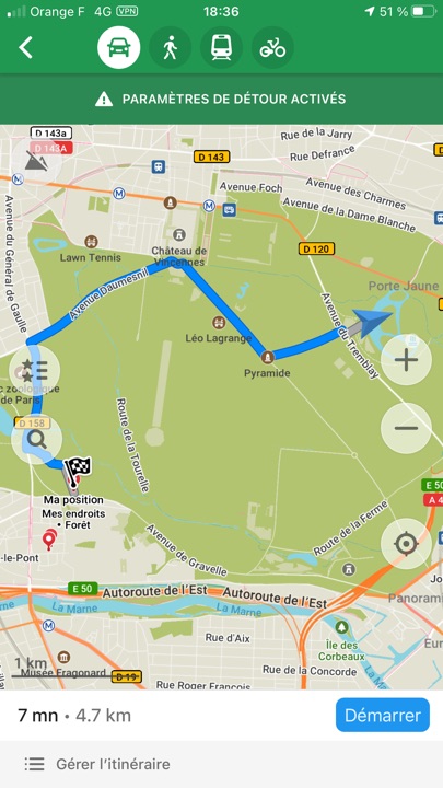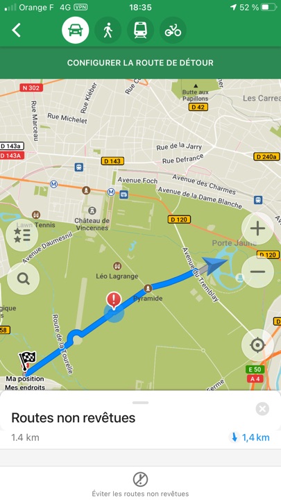On peut définir des itinéraires vers ou depuis une position enregistrée (ou pas), pour chacun des modes, voiture, piéton, en transports en commun, ou en vélo. Lors d’une balade au lac des Minimes, pour le mode automobile, l’application me proposait de traverser le bois de Vincennes 🙂 En choisissant les routes à éviter, ici, les routes « non revêtues », elle montrait un chemin plus conforme à celui que j’attendais !