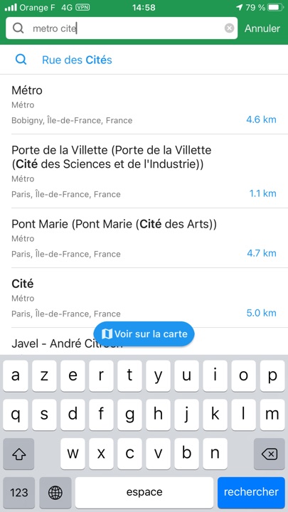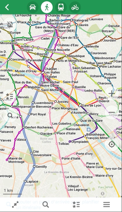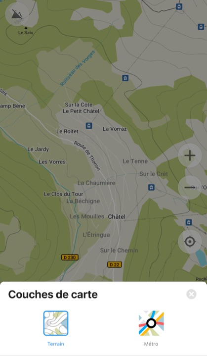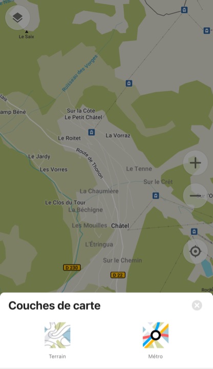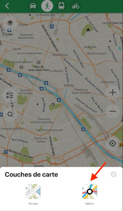 L’application permet de choisir le type de carte, y compris les transports en commun, en l’occurence le plan de métro parisien, et aussi les courbes de niveau, pratique lors de randonnées par exemple.