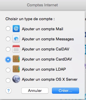 - sélectionner « Ajouter un compte CardDAV » puis saisir l’adresse du serveur sous la forme « https://MonServeurOwncloud.fr/remote.php/carddav/addressbooks/NomUtilisateur/contacts » en saisissant son identifiant et son mot de passe.