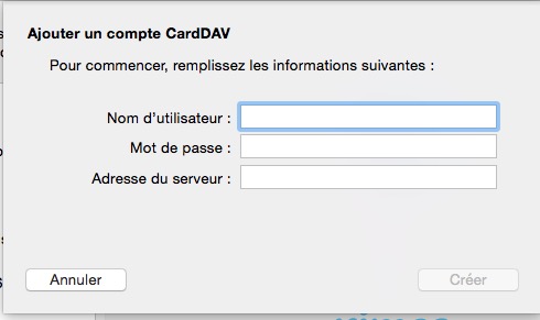 - puis saisir son nom d’utilisateur, son mot de passe et l’adresse du serveur sous la forme « https://MonServeurOwncloud.fr/remote.php/carddav/addressbooks/NomUtilisateur/contacts ».