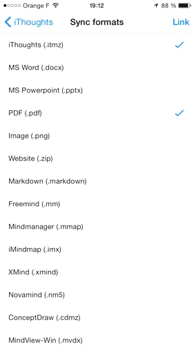 • choisir le format de synchronisation : j’ai sélectionné le format itmz, celui d’iThoughts, avec lequel je peux modifier un fichier sur le Mac, et le format PDF : à chaque synchronisation, les fichiers sont automatiquement convertis en PDF ; je peux ainsi les lire sur n’importe quel ordinateur ;