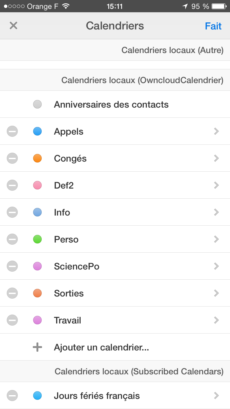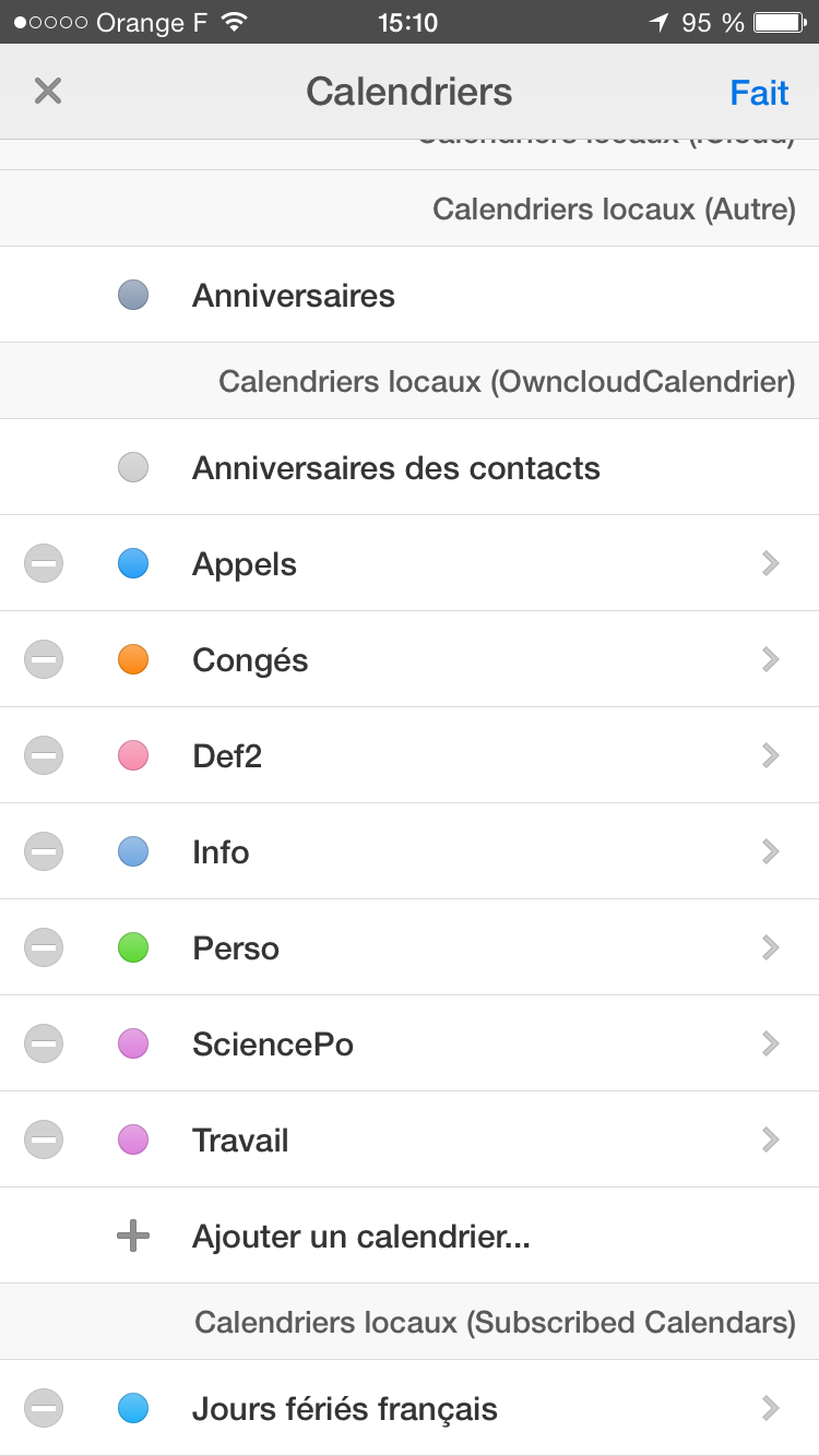 J’ai créé sur l’iPhone, avec l’application Calendars 5, déjà mentionnée plus haut, tous mes calendriers, en leur attribuant la couleur souhaitée, sous le compte ownCloud (en conservant dans un premier temps par précaution mes calendriers synchronisés avec iCloud).