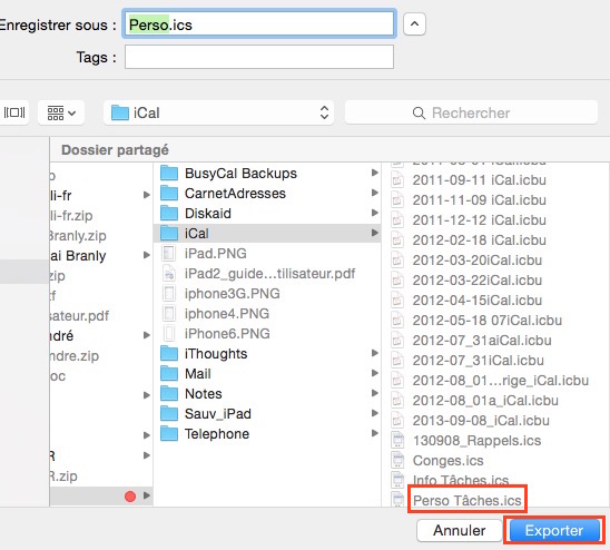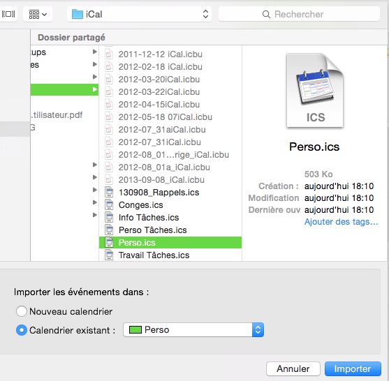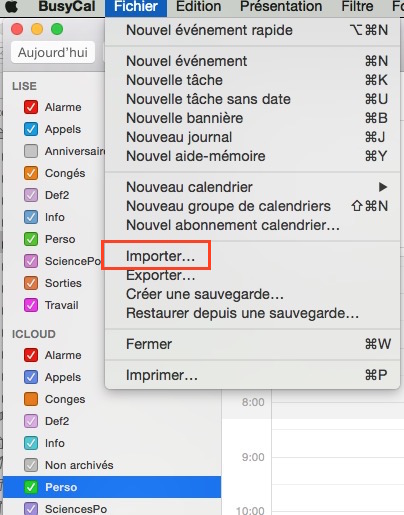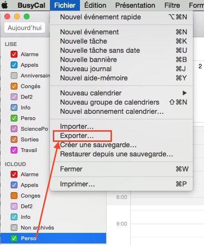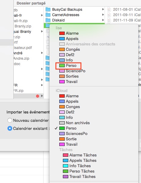 Les calendriers créés sur l’iPhone apparaissent sur le Mac sous le compte « LISE », en plus des calendriers iCloud. Sur le Mac, avec BusyCal, j’ai exporté chacun des calendriers iCloud, puis les ai importés sous le compte « LISE ». Les événements apparaissent deux fois tant que je n’ai pas désactivé l’affichage des calendriers iCloud. Après avoir constaté que la synchronisation s’effectuait correctement, j’ai supprimé l’ensemble de mes calendriers sous iCloud.