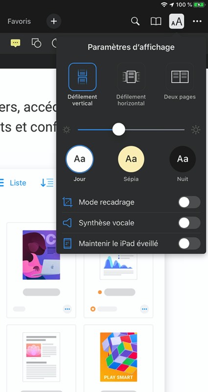 Parmi les options disponibles, on peut choisir les paramètres d’affichage (mode clair, sépia ou sombre), la taille de la police, afficher l’ensemble de ses annotations…