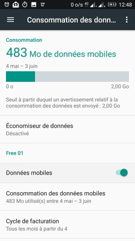 Ce qui est appréciable, c’est que depuis les notifications (un glisser depuis le haut du téléphone, vers le bas), on accède directement au partage de connexion. On peut définir le seuil de consommation de données à partir duquel être alerté.