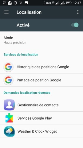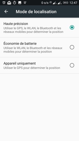 - puis activer le mode de localisation Haute précision : GPS, WLAN, Bluetooth et réseaux mobiles pour déterminer la position