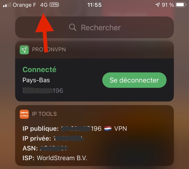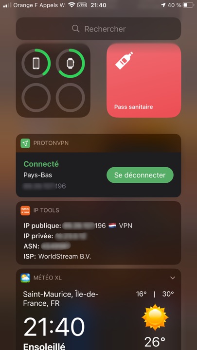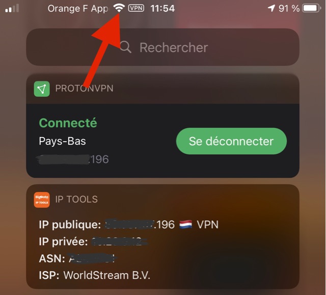 Sur iPhone et iPad, on dispose d’un widget, qui permet de se connecter/déconnecter rapidement et affiche l’adresse IP.