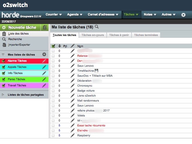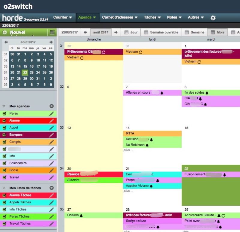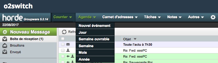Le transfert des blogs, sites web et mail s’est passé sans encombre… En revanche, question calendriers et contacts, ce fut plus difficile, notamment sous Android. Mon frère souhaitant abandonner la gestion du serveur ownCloud, nous avons testé les fonctionnalités offertes par le webmail Horde (1), mis à disposition par o2switch.