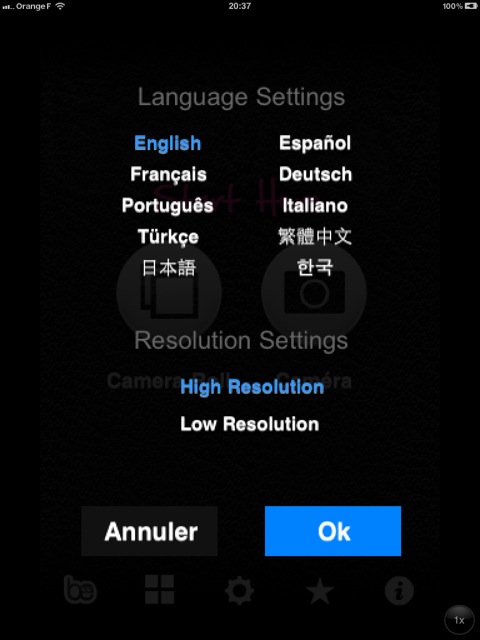 Comme pour toutes les applications décrites sur cette page, on peut directement prendre un cliché ou choisir une photo dans sa galerie. Les options permettent de sauvegarder l’original, sélectionner la résolution de la photo qui sera sauvegardée. Diverses options de partage sont disponibles : par mail, avec Twitter, Facebook, Flickr, Evernote.