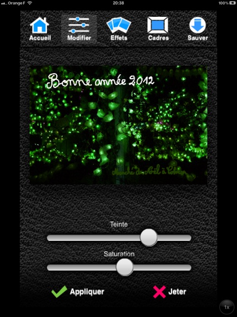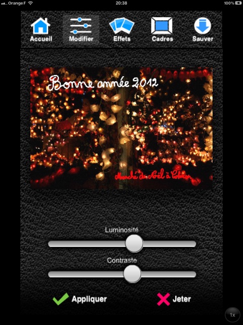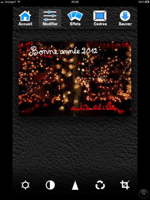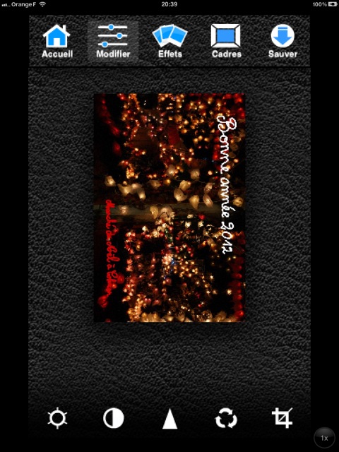La deuxième icône de la barre de menu supérieure permet d’apporter des retouches à ses images. La barre de menu inférieure propose alors le réglage de la luminosité, du contraste, de la saturation, de la netteté. On peut également effectuer une rotation et rogner ses photos, choisir un des effets proposés et enfin un cadre.