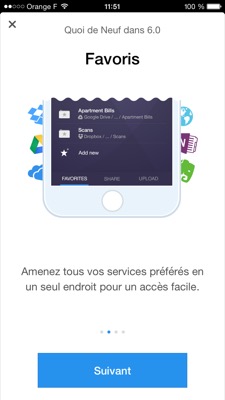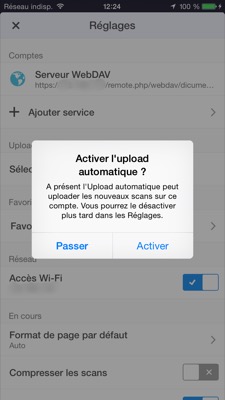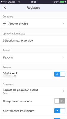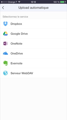 On peut bien sûr envoyer par mail ou imprimer les documents numérisés, utiliser iCloud pour partager les documents scannés ou n’importe quel serveur WebDAV, ce qui me permet, pour ma part, d’utiliser mon serveur ownCloud. Une option est même présente pour automatiquement télécharger sur le serveur les documents numérisés. Les serveurs en ligne tels que Dropbox, Evernote, Google Drive, iCloud, OneDrive sont également utilisables.